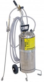 - Pulvérisateur à pression mobile en acier inoxydable monté sur un châssis roulant avec dispositif de fixation de la lance. Le réservoir est doté d'un revêtement intérieur en PE et ses composantes sont résistantes aux acides. Cet appareil convient à l'emploi des produits de nettoyage acides. Après l'emploi, cet appareil doit être vidé et rincé.